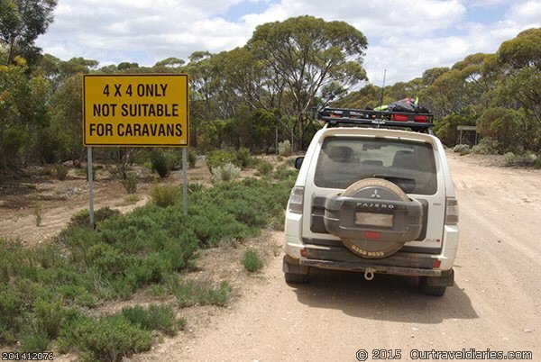 We were about 60kms from Balladonia and we saw a car up ahead pulled off the road. We slow down and check if they?re OK and they say they are so we move on. It looked like the axle on their trailer had snapped but they were well prepared and had nearly finished their repairs.