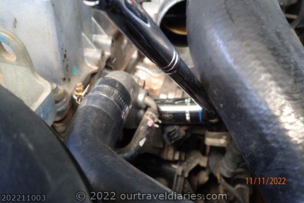 Then carefully place the deep socket over the temperature sensor, loosen and remove the sensor. I found that the coolant sensor was very tight and did require a bit of effort to remove. The difficulty in removing the temperature sensor is probably from the high strength loctite that Mitsubishi used on the sensor.