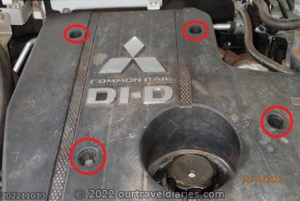 Pictures of Mitsubishi Pajero NW 4M4 diesel engine cover found on the internet suggest that there may only be three bolts.
