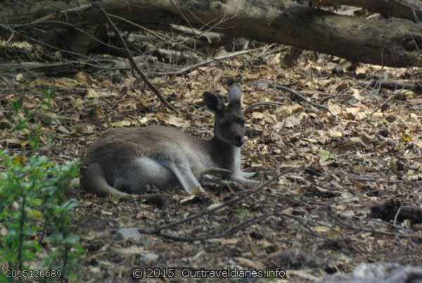 Just beyond the fig tree we were privileged and excited to see a kangaroo laying in the shade with a joey in her pouch. She allowed us to get some photos of her. There was another roo resting a bit further away.