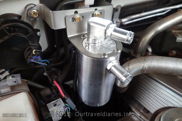 The OCC-MB-MP2 bracket fits to the firewall at an angle. Position the HPD catch can so it is level then tighten up the bolts that holds the OCC-MB-MP2 Firewall Bracket to the OCC-MB-MP3 90 degree bracket. Check that the HPD catch can does not interfere with any other part of the engine and that the hoses are also clear of obstructions or hot engine parts. The catch can did initially hit on some what some air con pipe but with a bit of adjustment enough clearance was created around the HPD catch can.