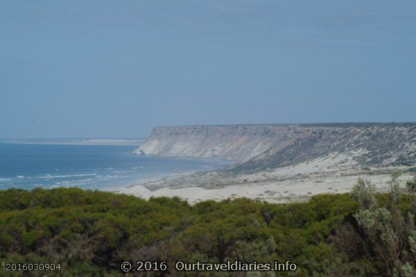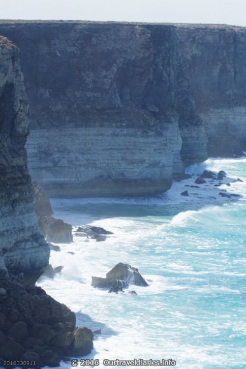 The Great Australian Bight is a fantastic sight and has to be seen to be believed. When we pulled in it was very, very windy and slightly overcast but the view was worth braving the wind. The walls of the Bunda Cliffs of the Great Australian Bight are reported to be between 65 and 100 metres high. Another sight you can enjoy along here between May and October is the Southern Right Whales who visit the area with their calves because it’s relatively sheltered. This is a sight we were fortunate to witness in 1998 although back then there were no boundary fences along the look out points of the Bight. There was however a raised viewing platform near the Head of the Bight Visitor’s Centre. Today there are signs warning of cliff falls and barriers have been erected to stop visitors getting too close to the edge.