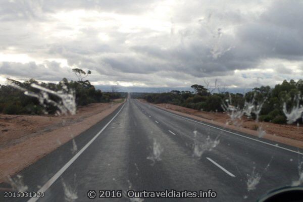 Just out of Balladonia we encountered a swarm of flying ants. When we were kids we were told that flying ants meant rain/storm coming. The swarm lasted about 50kms and we went through one windscreen bottle and half of another keeping the windscreen clean. As we got closer to Norseman and with fading light we decided to check in to the Great Western Motel rather than start down the old Hyden – Norseman road tonight. Tomorrow we head home via the old Hyden – Norseman road.