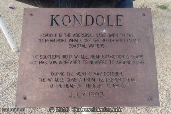 It’s Thursday morning and we’re about 250kms east of Eucla but first we’ll head into Nullabor and top up the tank, it’s only 50 kms down the road. Nullabor is nice stop and the roadhouse has good bathroom facilities with coin operated showers ($1.00) If you haven’t passed this way before you can’t miss the roadhouse, there is a statue of a Southern Right Whale known as Kondole in the local Aboriginal language. There is a dreamtime story as to how Kondole came to be. The South Australian Dept of Environment brochure on Southern Right Whales tells the story as follows;