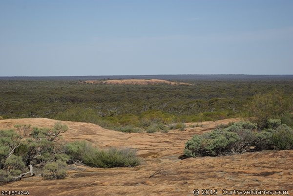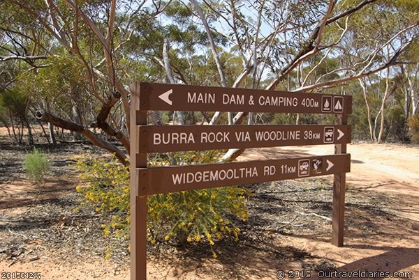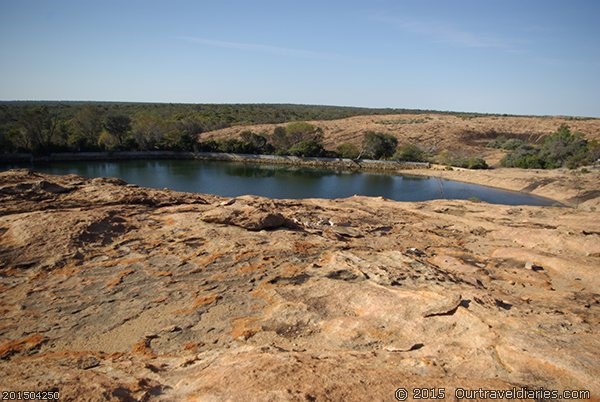 When we got to Burra Rocks we realised we forgot to get ice in Coolgardie – Doh!. Oh well, we worry about it after our walk. The walk up Burra Rock was pleasant and at the top was a huge body of water and remnants of a dam wall. The water was used to fuel the steam trains transporting timber to Kalgoorlie back in the ’20s & 30’s. It’d make a good swimming hole today.