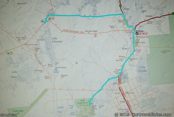 We filled up at Norseman, grabbed an ice cream and took off for Peak Charles. Just as we turn off the bitumen to head into the Peak Charles National Park we check the mobile phone and found that by holding your tongue right and pointing the phone to the sky we had enough service to send and receive a couple of texts – who’d have thought? We arrive at Peak Charles about 3.00pm and make camp for the night.