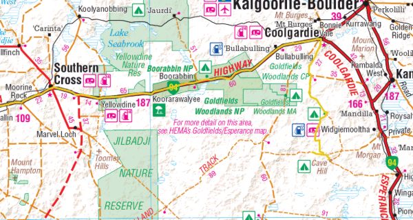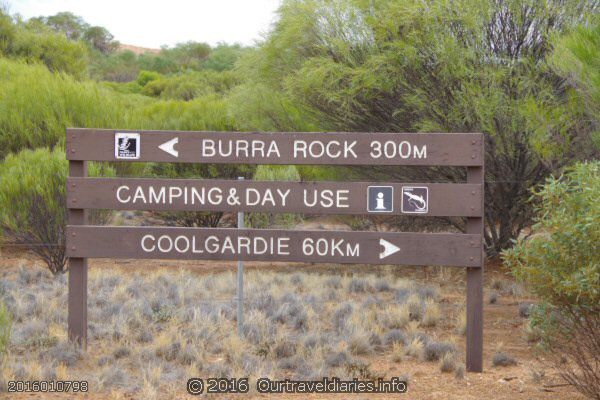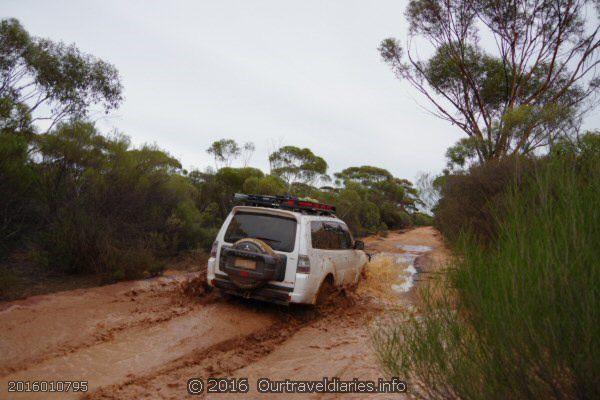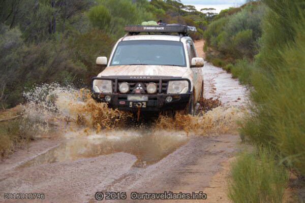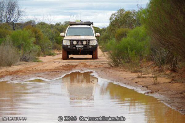 When we left Cave Hill we headed west toward Victoria Rock Road rather than heading straight to Coolgardie. Wow! we thought we’d seen the last of the puddles for this trip but we were wrong. Puddle after puddle greeted us for about the first 10 kms and the going was a bit slow. A bit further down the track we came across a long puddle and got out to walk it. Lucky we did. The line through the puddle dropped off on the right hand side to a depth we weren’t comfortable negotiating so we turned around and headed back to Cave Hill where we had left 2 hours before. We then had no alternative but to take the road to Coolgardie via Burra Rocks.