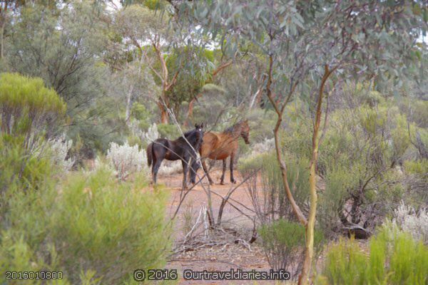 A short distance South of Coolgardie we saw a couple of brumbies up ahead feeding at the side of the road. We slowed to allow them to move away which they did. As we got closer we could see one was a pregnant mare and the other a foal. The term Brumby is thought to have originated in the Australian Alps when a settler by the name of James Brumby let his horses run free. They adapted to the Australian landscape and inter bred with other breeds of horses including Clydesdales, Arabians, Draft horses and others. They developed into a very hardy breed and were used by the Australian Army in the Boer (South Africa), First and Second World Wars. Today the topic of Brumbies brings up strong feelings on both sides of an argument. Some say they’re pests/feral others believe they should be allowed to continue running free and not be culled.