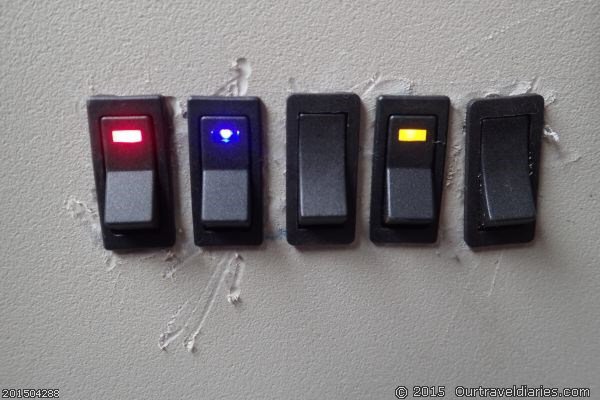 The first switch (on/off) on the left with the red light is for a cabin light fitted in rear of the truck. The blue and