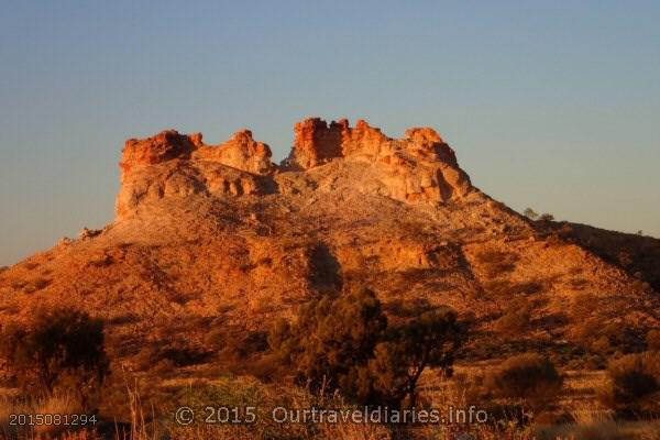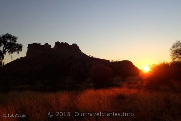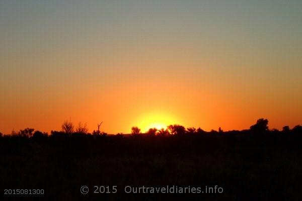 Despite Northern Territory’s bad roads we have to say their parks and wildlife dept have very reasonable camping fees; it’s only $3.30 per person per night to camp at Chambers Pillar. Other travellers arrived around 4.30pm and by 5.00pm we all made our way to the viewing area to see the sunset. The changing colors of the evening were a sight to see and all too soon it was over and another day came to an end.